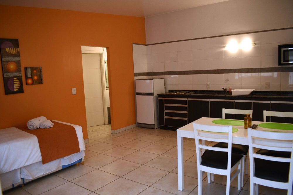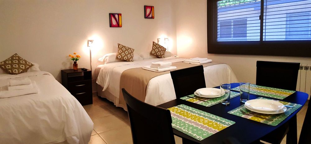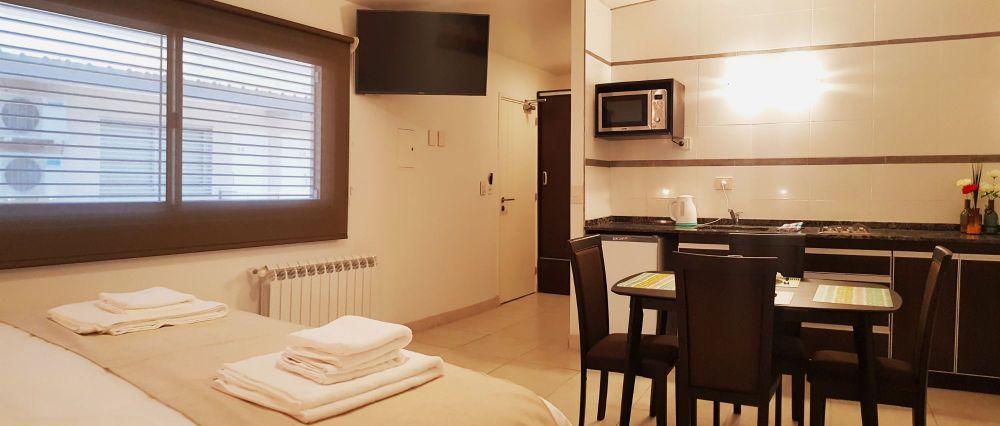 Departamento de un ambiente equipado para hasta 3 personas. Ubicados en Planta Baja y Primer piso por escaleras. Cuenta con cocina completa, provista de vajilla y utensilios de cocina, heladera con freezer, anafe de 2 hornallas, microondas con grill y hervidora de agua. Podrá descansar en un sommier King Size Premium de 2x2 m. Cuenta con Smart Tv de 43” con acceso a plataformas de streaming. La caja de seguridad es digital y con capacidad para una laptop. El baño es muy amplio, cuenta con ducha y secador de cabello. Se provee de ropa de cama, de baño y amenidades.